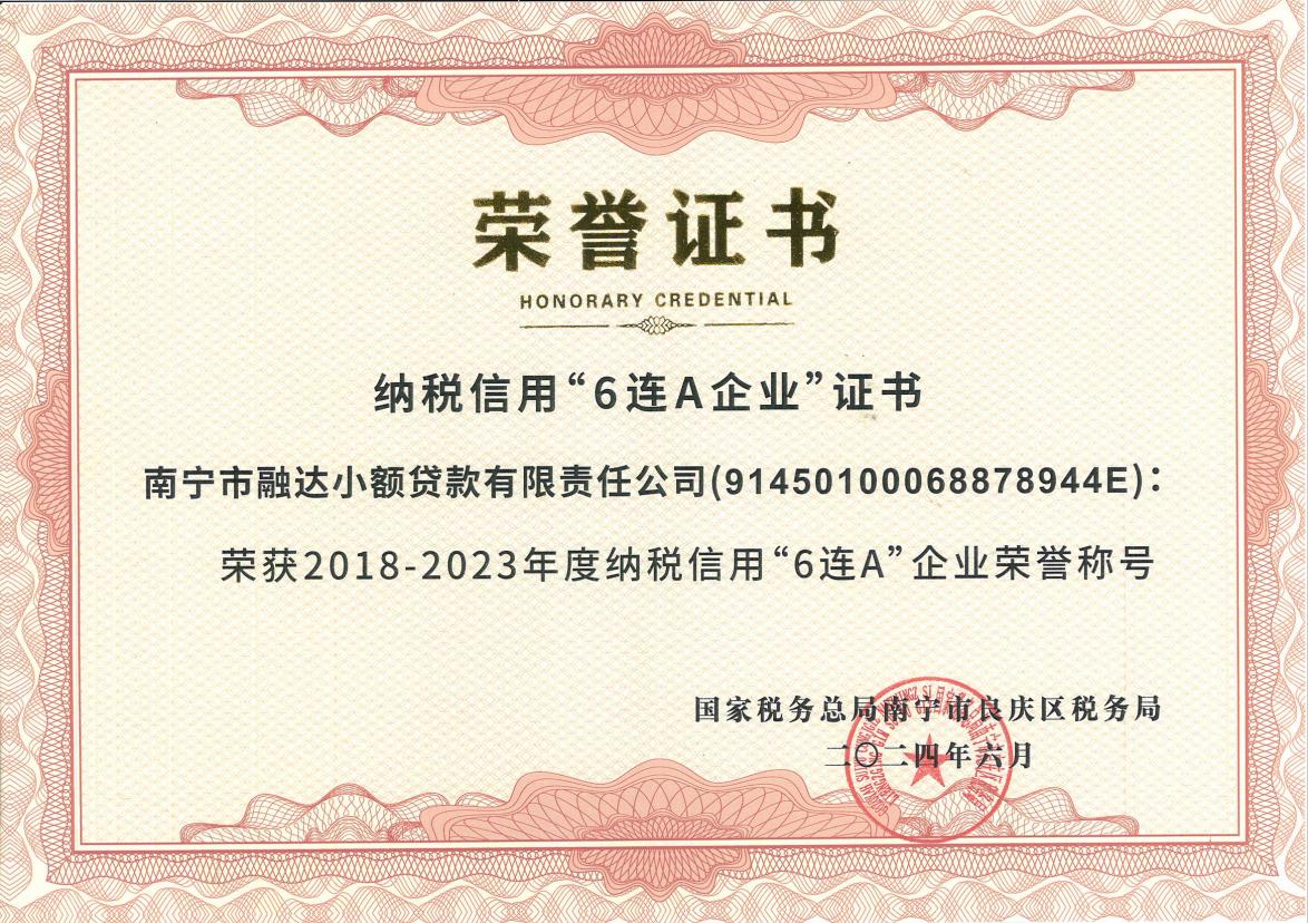 融達(dá)小貸公司榮獲納稅信用“6連A”企業(yè)榮譽(yù)稱號(hào)