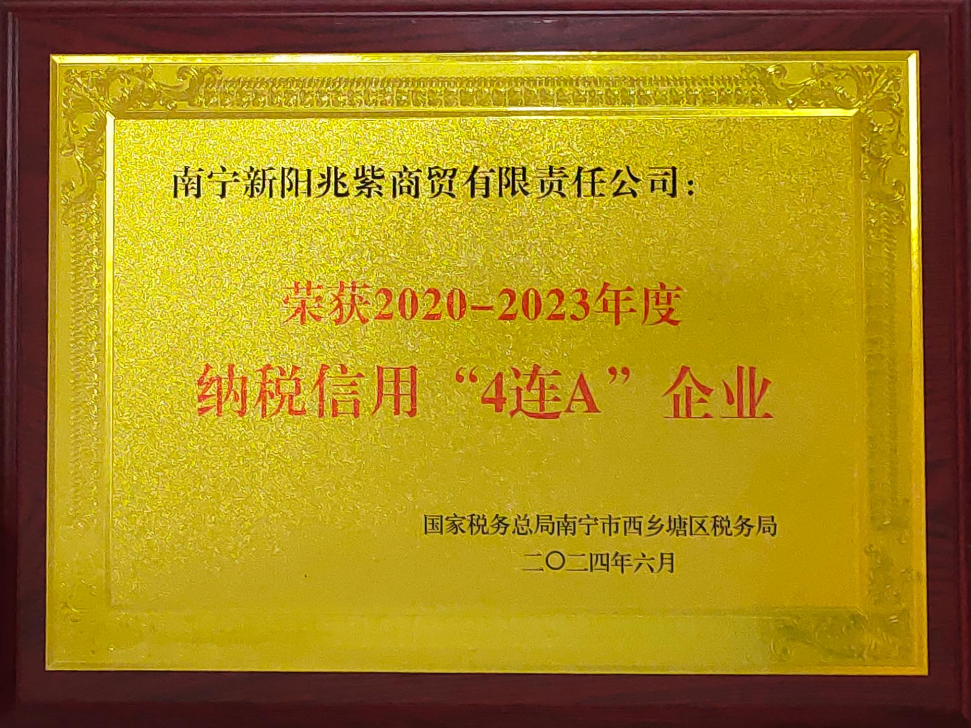 新陽兆紫商貿公司榮獲2020-2023年度納稅信用“4連A企業”榮譽稱號