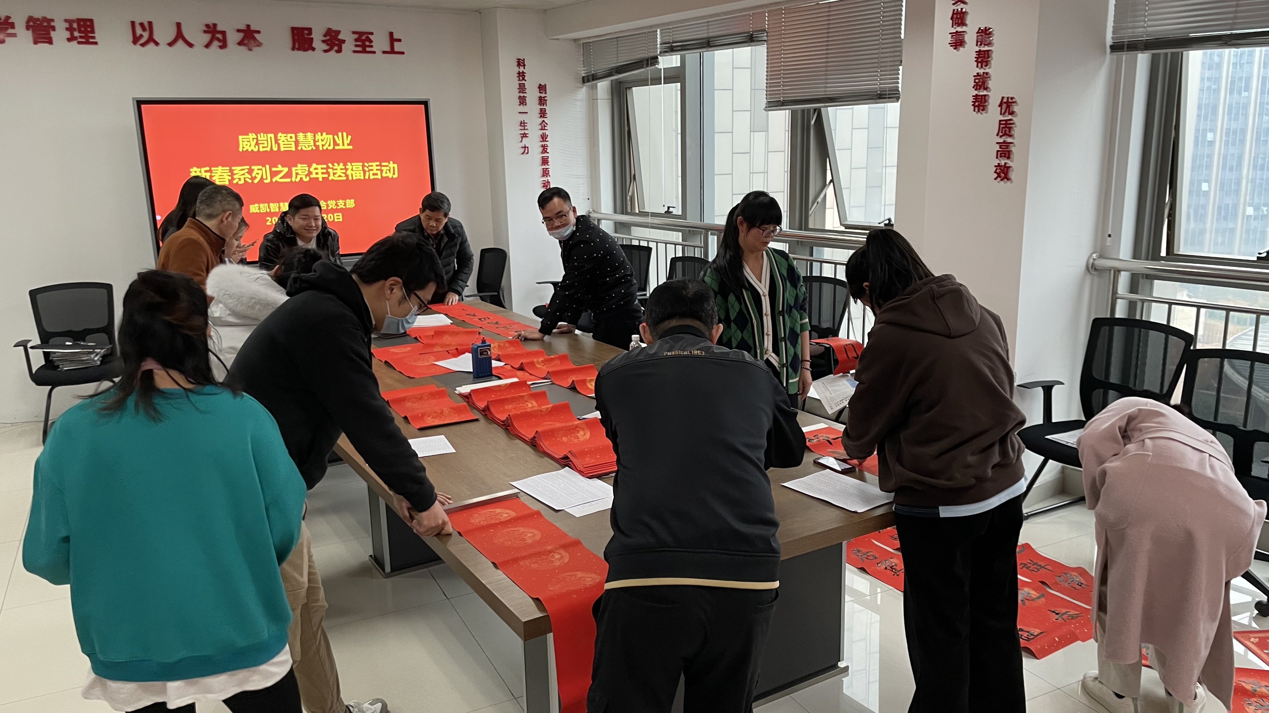 活動現(xiàn)場轉(zhuǎn)眼,距離農(nóng)歷新年的腳步越來越近了。為了弘揚中華傳統(tǒng)文化,增添公司新年氛圍,2022年1月20日威凱智慧物業(yè)公司聯(lián)合黨支部組織了“寅虎迎春 墨香送福”寫春聯(lián)送福主題黨日活動。活動組織了公司黨員職工、家屬現(xiàn)場書寫春聯(lián),為即將來臨的春節(jié)增添了濃濃的喜慶氛圍。活動現(xiàn)場,書法“達(dá)人”們手持文房四寶,揮毫潑墨,熱情洋溢地寫下一副副春聯(lián)和一張張“福”字,一筆一畫遒勁有力,一字一句增添吉祥瑞氣,其他黨員