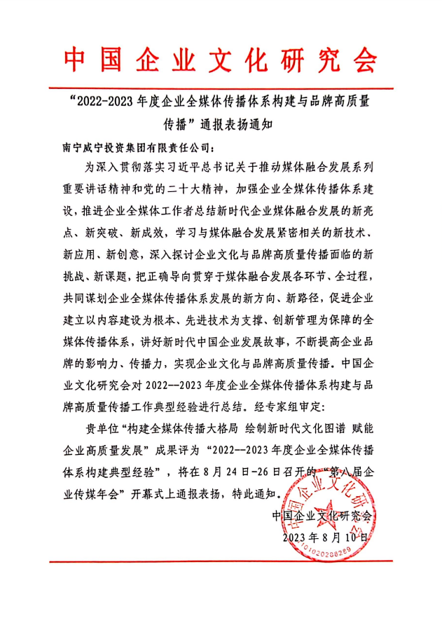 中國企業(yè)文化研究會于2023年8月24日-26日在山東省泰安市舉辦“加強全媒體傳播體系建設,實現(xiàn)品牌高質(zhì)量傳播---第八屆企業(yè)傳媒年會”。南寧威寧集團《 構建全媒體傳播大格局 繪制新時代文化圖譜 賦能企業(yè)高質(zhì)量發(fā)展》成果被評為“2022-2023年度企業(yè)全媒體傳播體系構建典型經(jīng)驗”并在會上通報表揚。據(jù)了解,面對輿論生態(tài)、媒體格局、傳播技術的深度變革,南寧威寧集團通過借助“全程媒體、全息媒體、全員媒體、全效媒體...