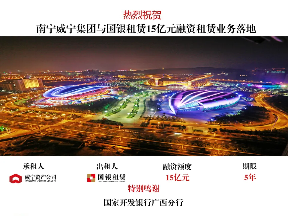 2020年4月27日,南寧威寧集團與國銀租賃五年期、15億元融資租賃(售后回租)業(yè)務(wù)完成協(xié)議簽訂并成功首次提款3.5億元,剩余額度將根據(jù)資金需求分批次提款。這是南寧威寧集團繼與交銀租賃、招銀租賃、浦銀租賃、外貿(mào)租賃成功合作后再次獲得國內(nèi)主流大型金融租賃機構(gòu)的大力支持,表明了金融機構(gòu)對集團償債能力以及未來改革發(fā)展持續(xù)向好的充足信心。