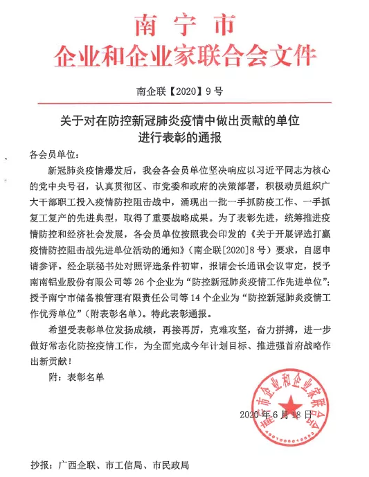 近日,從南寧市企業和企業家聯合會傳來喜訊,南寧威寧集團、南寧百貨大樓公司、威寧生態園公司喜獲“防控新冠疫情工作先進單位”;儲備糧公司、天恒電影公司、威寧捷信公司、威寧酒店公司喜獲“防控新冠疫情工作優秀單位”。