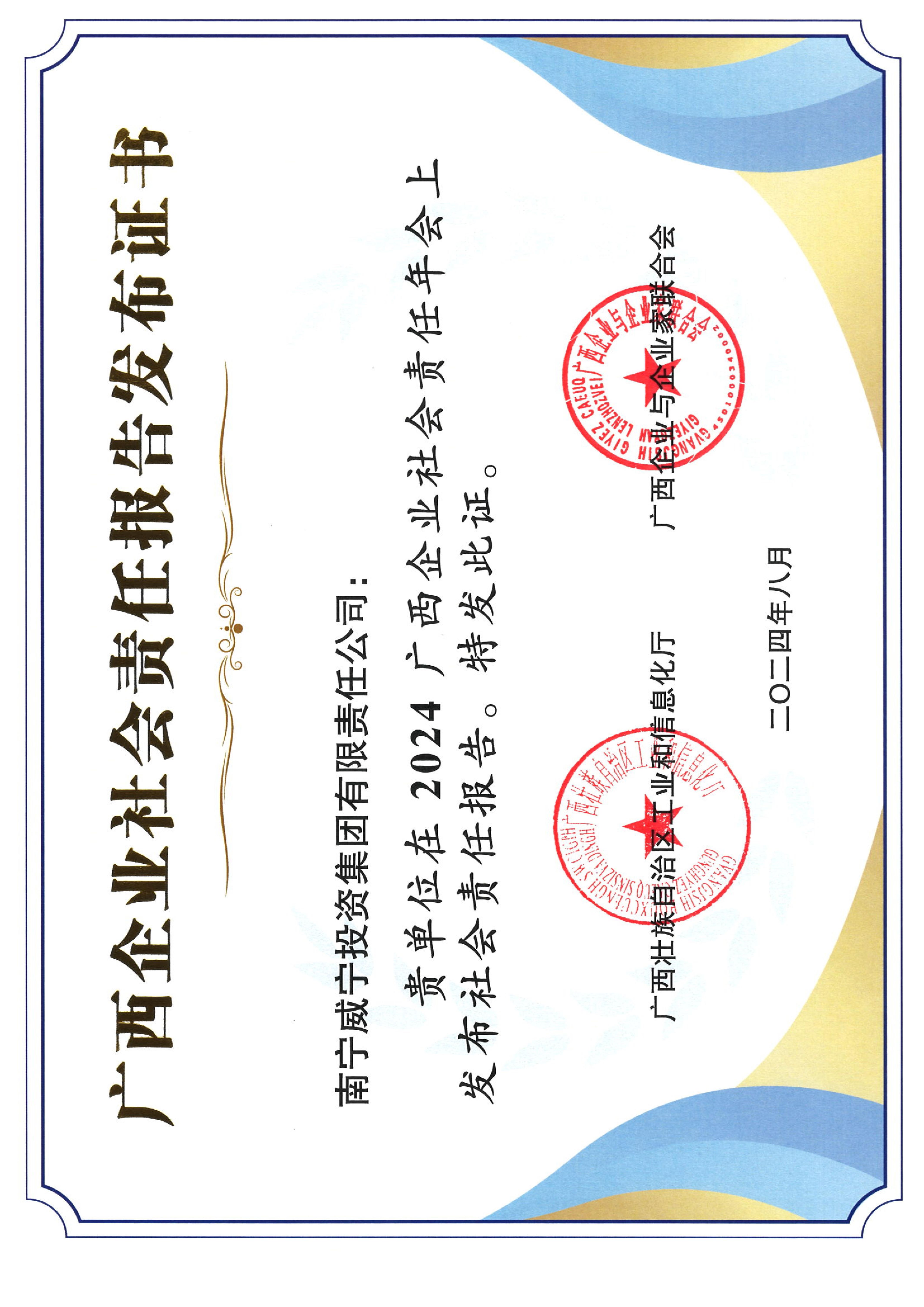 2024年8月28日,由自治區(qū)工業(yè)和信息化廳、廣西企業(yè)與企業(yè)家聯(lián)合會主辦的“履責(zé)創(chuàng)新 爭創(chuàng)一流2024廣西企業(yè)社會責(zé)任年會”在南寧隆重舉行,南寧威寧集團等85家企業(yè)集中發(fā)布了企業(yè)社會責(zé)任報告,并獲頒《廣西企業(yè)社會責(zé)任報告發(fā)布證書》。南寧威寧集團連續(xù)九年參加企業(yè)社會責(zé)任報告發(fā)布會。集團一直致力于在創(chuàng)新發(fā)展中積極履行社會責(zé)任,以“打造國有服務(wù)民生品牌,共創(chuàng)都市美好幸福生活”為使命,...